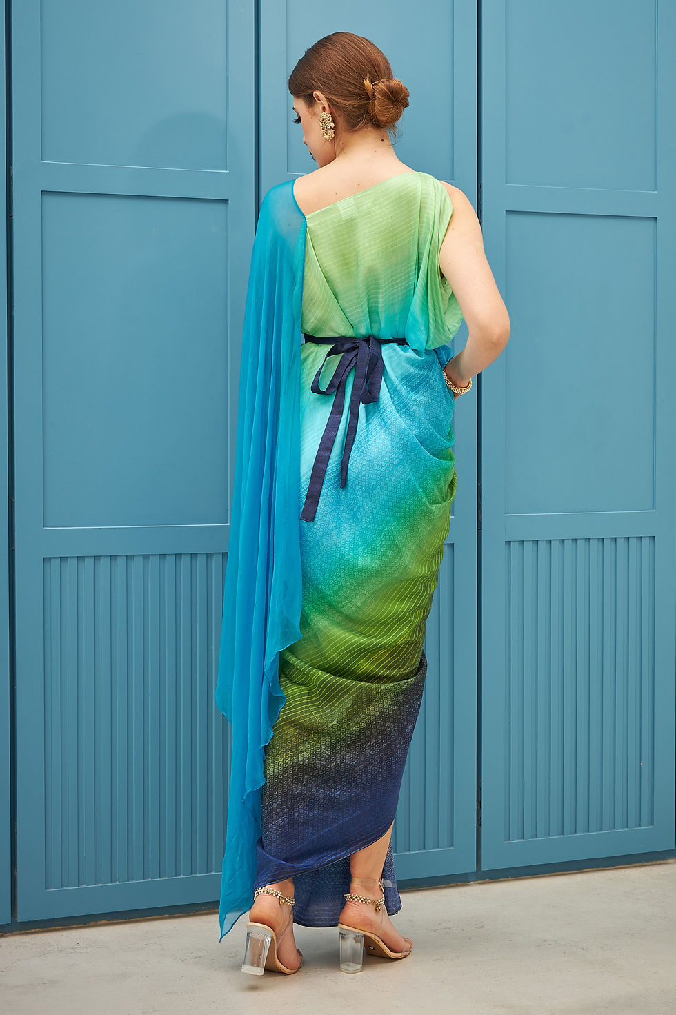 Blue & Green Ombre Saree Gown With Hand Embellished Belt
