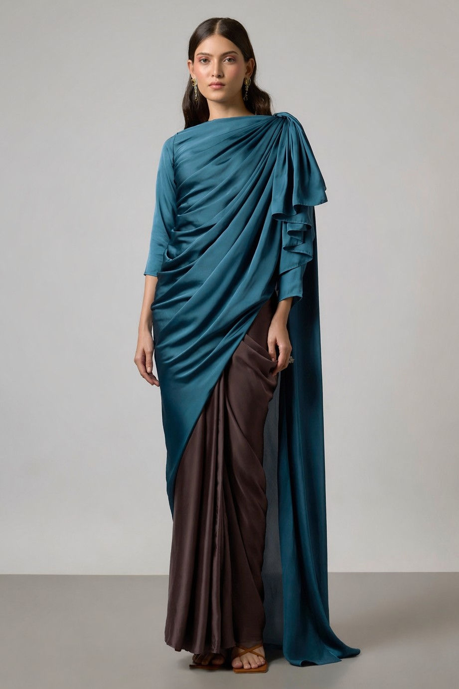 Featuring an iridescent blue green U neckline drape dress in a vegan silk base with an asymmetric hem & sleeves. It is stitched at waist to create a flare.